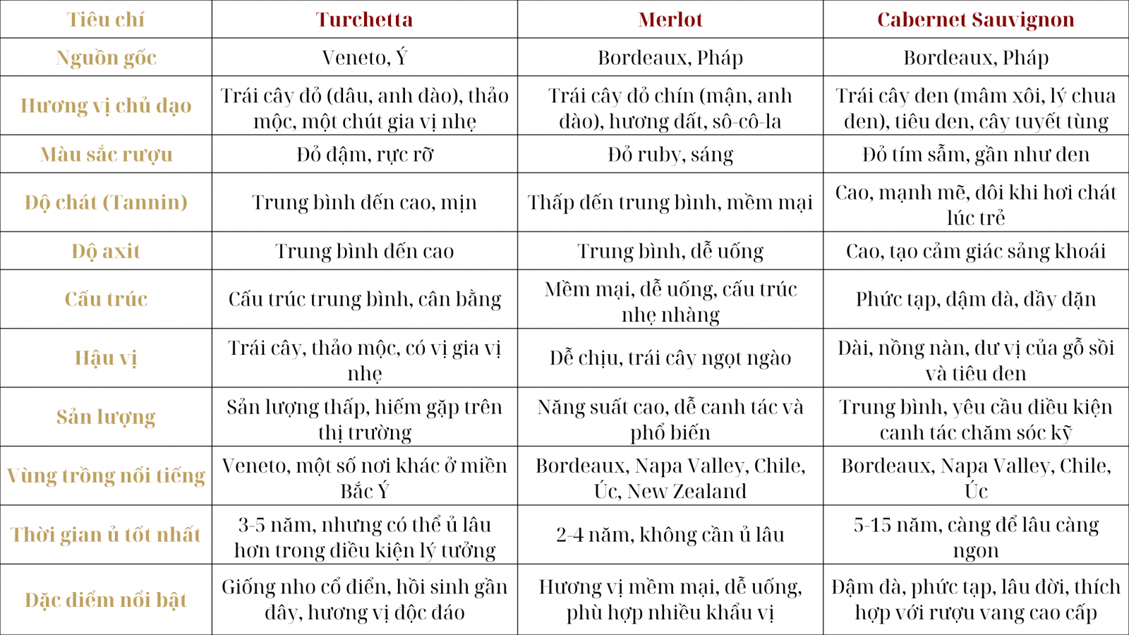 Từ bảng so sánh trên, có thể thấy rằng giống nho Turchetta mang lại hương vị và cấu trúc độc đáo so với hai giống nho phổ biến là Merlot và Cabernet Sauvignon. Turchetta nổi bật với hương vị thảo mộc, độ chát vừa phải và khả năng kháng bệnh tốt, thích hợp cho những người yêu thích sự mới lạ trong rượu vang Ý.